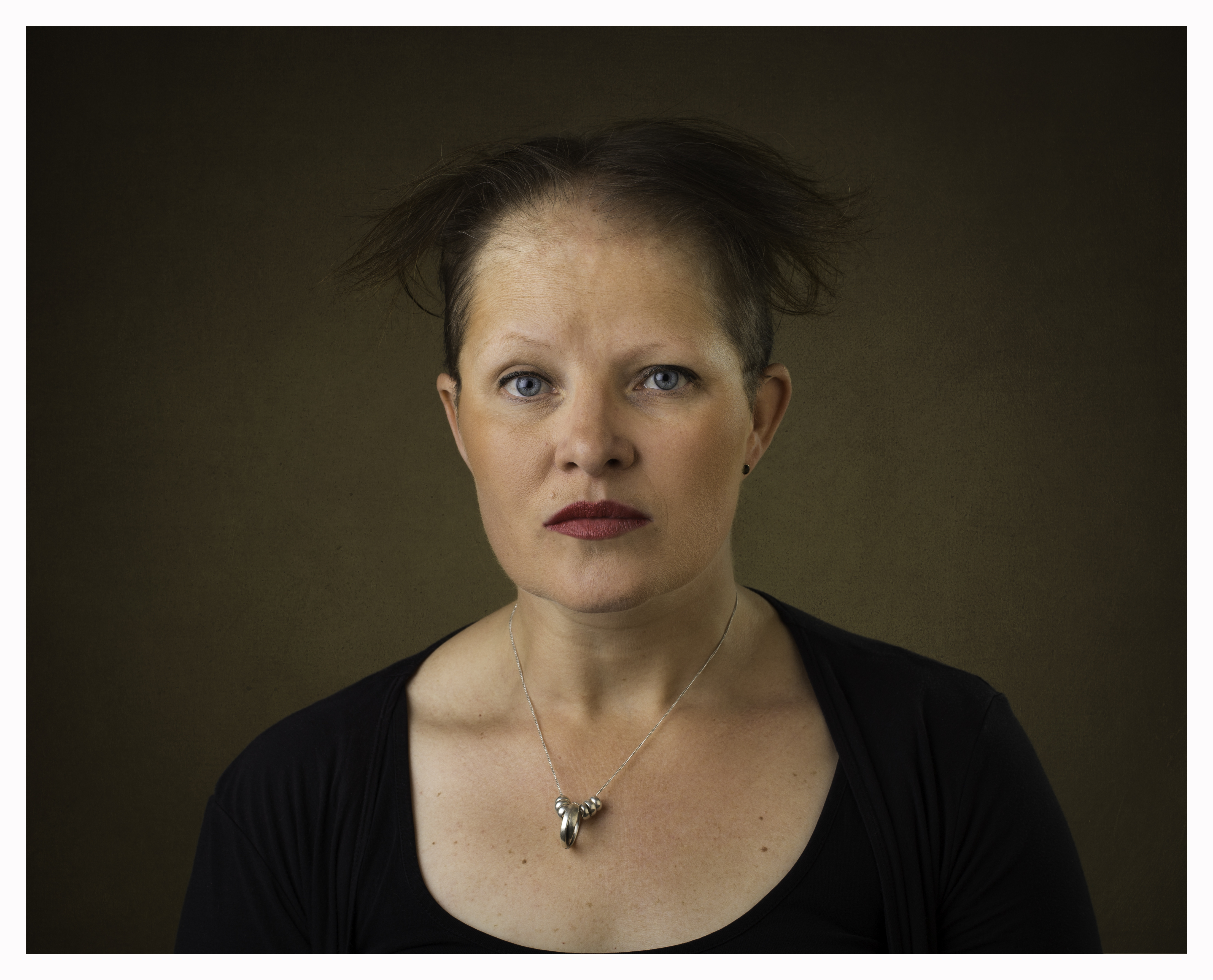 Hilary : Um Initially I sort of struggled with the skin tone of her face, um, but it’s such a striking portrait and her intense gaze it really sort of got me in. I read this as she has had chemotherapy and she has lost her hair and her hair is grown back. And I read the fact that possibly radiotherapy and often with people, I’m interpreting this myself, with radiation therapy you can get radiation burns, so maybe she has had radiation on her head, who knows, but I just think that there is a story in those eyes, a story in her face, the hair, the fact that it is presented with such a direct gaze, and a very simple background, black top, you know, it’s an extremely simple direct portrait. Strong, but sad.